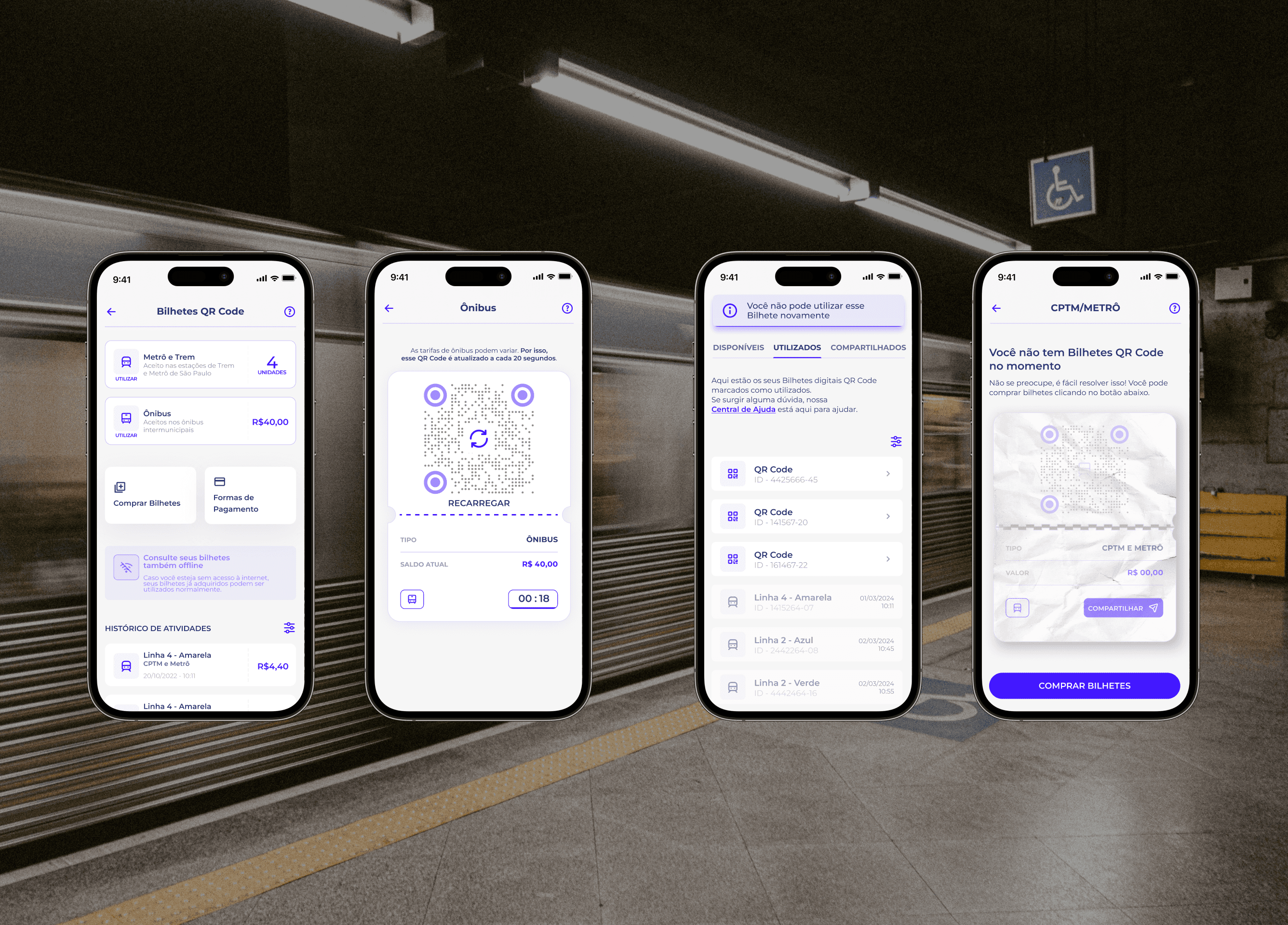for São Paulo’s public transportation system, improving the experience for over 4 million users. With zero research and tight deadlines, I rebuilt the key flows (recharge, QR, balance) to reduce friction, scan fast, and keep things scalable. No fluff. Just clarity and decisions that mattered.