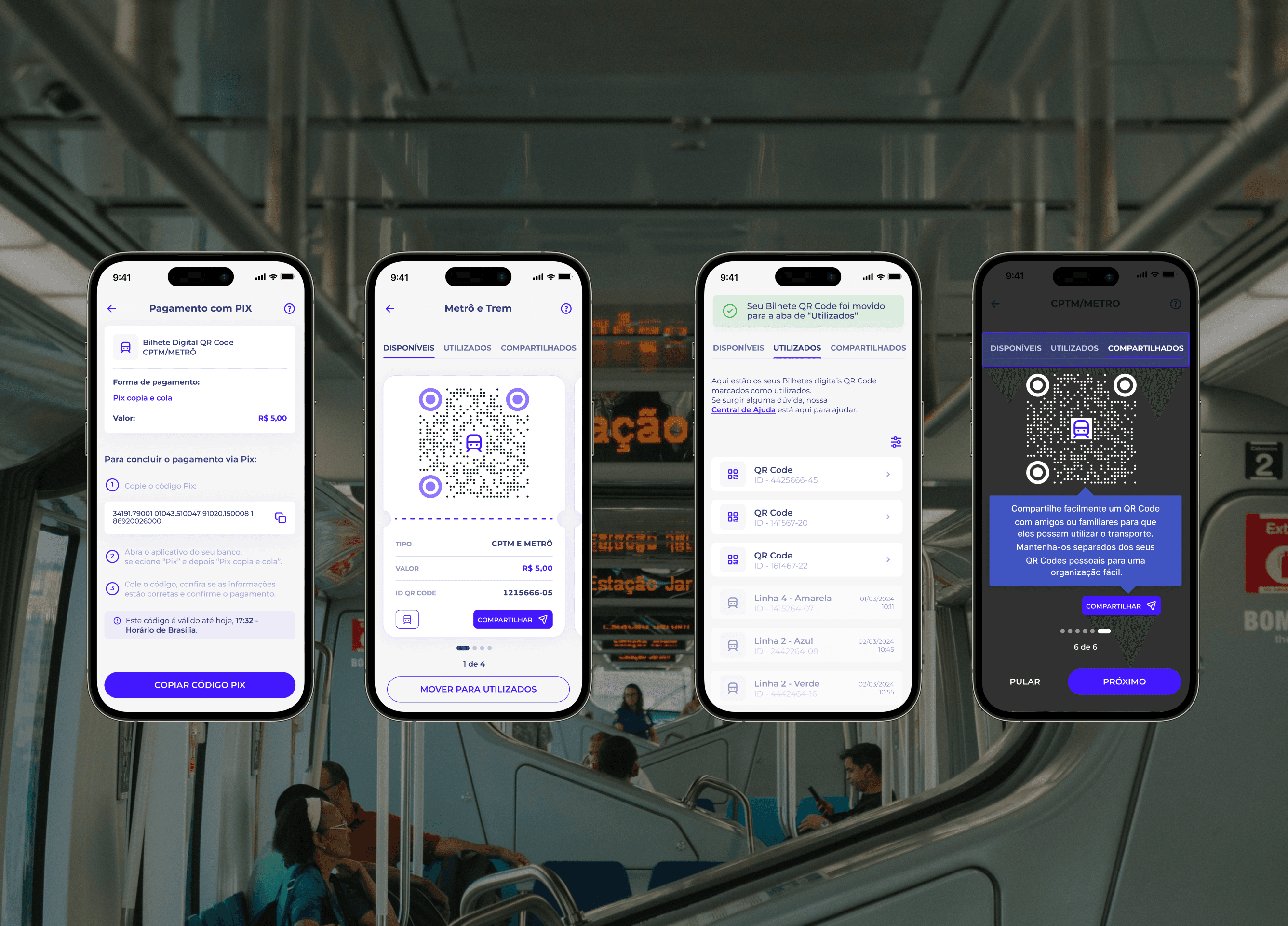 A full demo of how users buy QR tickets for metro and train rides using Pix,